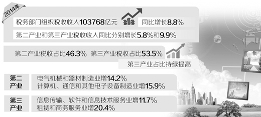 “从税收收入结构看,经济结构调整态势良好。”税务总局新闻发言人、办公厅主任王陆进介绍说,2014年,我国第二产业和第三产业税收收入同比分别增长5.8%和9.9%,二产税收占比46.3%,三产税收占比53.5%,第三产业税收占比持续提高,反映出经济结构继续优化。