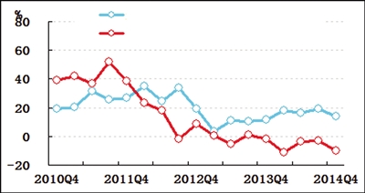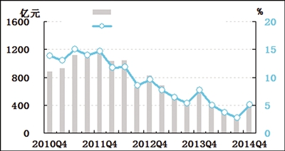 经初步季节调整,2014年四季度,煤炭产业固定资产投资总额为1313.9亿元,同比下降18.5%,同比降幅比三季度扩大15.5个百分点,为15年以来的最大降幅。煤炭市场需求疲软,产能过剩严重,盈利能力下降,直接导致企业投资意愿不强;有关部门加大了煤炭生产、建设监管力度,也影响到煤炭产业的投资。