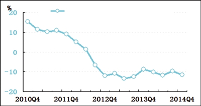 经初步季节调整,四季度,煤炭产业主营业务收入为7639.3亿元,同比下降10.1%,降幅比三季度扩大7.3个百分点,同比降幅在连续两个季度收窄之后再次扩大。煤炭行业销售降幅扩大一方面与工业生产增长回落,尤其是与火力发电及钢铁生产减弱有关。数据显示,2014年10月、11月,火力发电同比分别下降5.8%和4.2%,明显低于前三季度0.7%的平均增长水平;粗钢产量同比分别下降0.3%和0.2%,而前三季度各月均为同比增长,且平均增速为2.3%。另一方面,同比价格跌幅的扩大也在一定程度上导致了主营业务收入增长的回落。