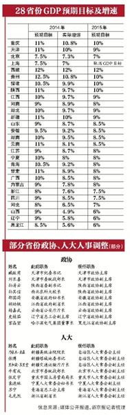 记者梳理发现,在“新常态”背景下,2015年GDP预期目标同2014年相比,2015年有26个省份下调了预期增速,西藏与去年持平(12%),上海则在政府工作报告中首次取消了GDP的目标。其中,山西、甘肃和辽宁三省下调幅度最高,在3%左右。黑龙江、青海、贵州、云南均下调了2.5%。