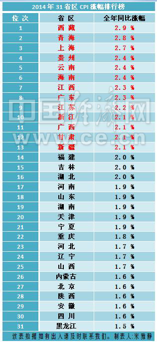 在中国经济网记者制作的2014年31省区CPI同比涨幅排行榜中,可以清晰的看到,西藏、青海、上海居前三位,其中西藏CPI同比涨2.9 %,青海同比上涨2.8 %位于第二,上海CPI同比涨2.7居第三。此外有15个省区回归“1时代”其中黑龙江仅上涨1.5%,居全国最末位。
