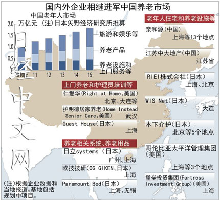 韩国、台湾及德国等相关企业也伺机进入这一市场。日本贸易振兴机构的水田贤治表示:“目前还没有一家外资企业在中国大获全胜”。中国政府2014年11月发布了促进外资进入养老市场的通知。允许外资企业单独设立设施,还鼓励开展连锁服务。