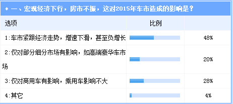 中国经济进入“新常态”,处于增长速度换挡期,下行是普遍预期,而与此同时,房市也面临重大拐点,房价同样面临下跌压力,如此经济形势会对新一年的车市造成怎样的影响?调查一中,多数参与者(占比48%)认为国内车市将紧跟经济大势,增速下滑是不可避免的,甚至以去年个位数的增幅为基数,2015年出现负增长也并非不可能。