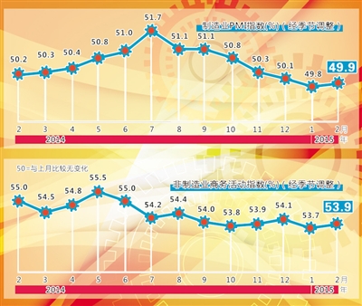 经济日报北京3月1日讯 国家统计局、中国物流与采购联合会1日发布的数据显示,2月份我国制造业和非制造业采购经理指数(PMI)分别比上月回升0.1和0.2个百分点,达到49.9%和53.9%。