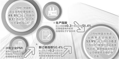 数据显示,2月份,中国制造业采购经理指数为49.9%,比上月微升0.1个百分点,但仍然位于荣枯线以下。
