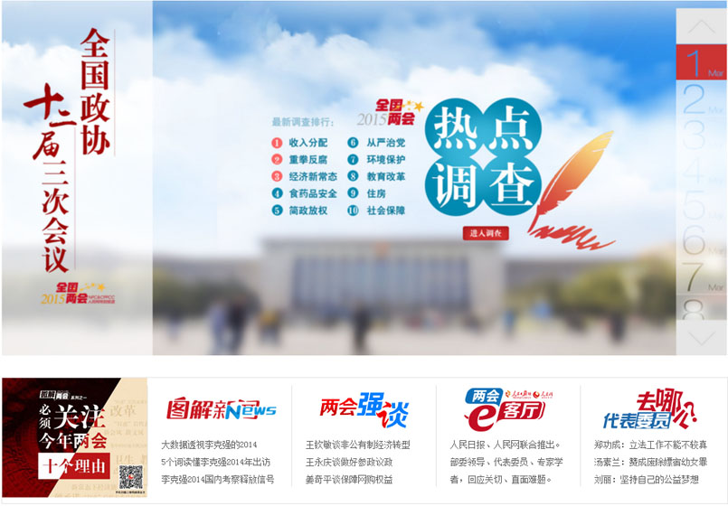 专题分为要闻、图解、高清图、人民电视、互动、访谈、读报告、记者会、财经等十大版块。
