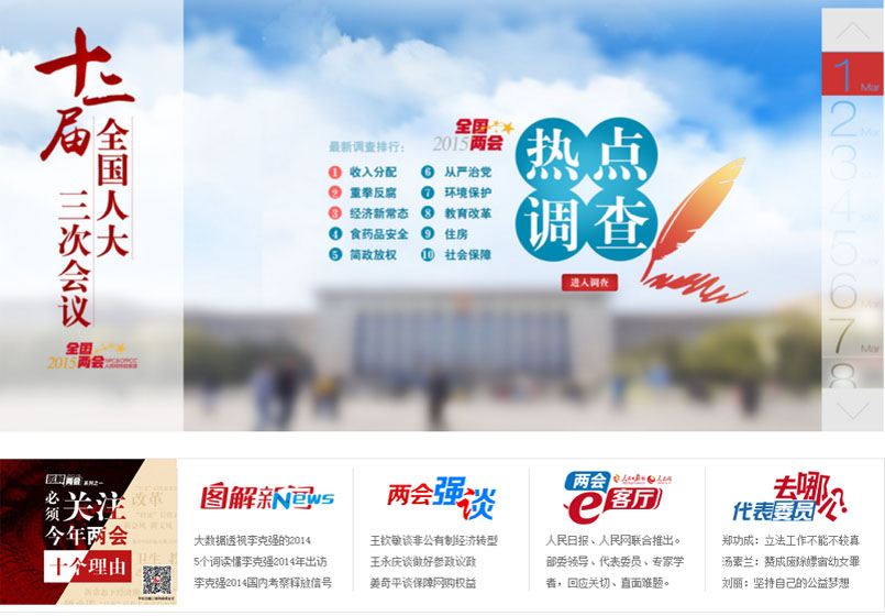 页面设计方面,人民网2015年全国两会专题首屏推出支持动态切换的自适应全屏高清大图,动态大图将根据两会日程进行实时更新。专题内根据报道内容不同,区分出十大板块,每个版块高度设计在一屏左右,按类别区分版块内的展示内容,方便网民浏览。在每屏下方,设置浮动的快速导航条,便于网民浏览时查询栏目或回到顶部。(中国网信网)