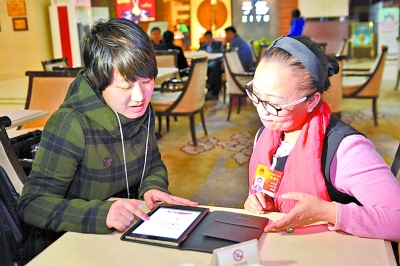 3月3日,全国人大代表、山东省青岛农业大学教授董雅娟(右)在会议驻地查看《炫融特刊》。光明网记者 王树平摄