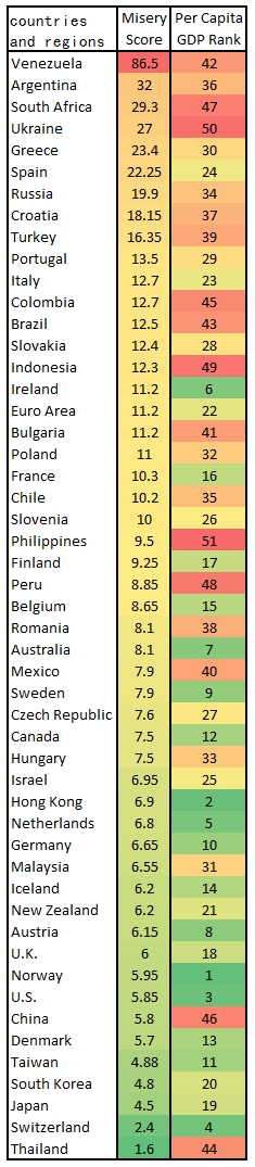 根据彭博新闻社编撰的“痛苦指数”,在最“幸福”国家排名中,泰国、瑞士、日本占据前三,中国大陆第七,美国第八。
