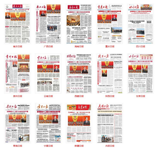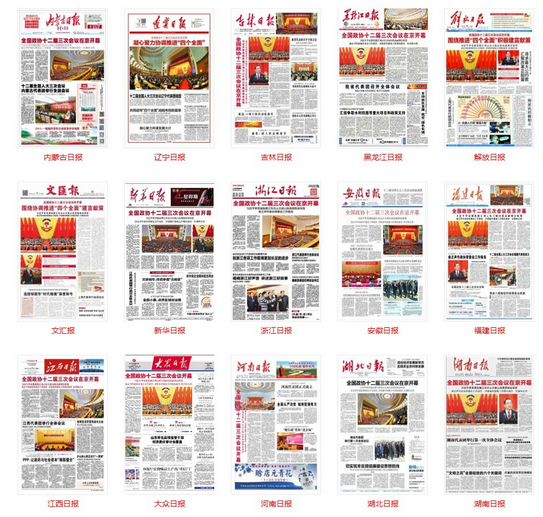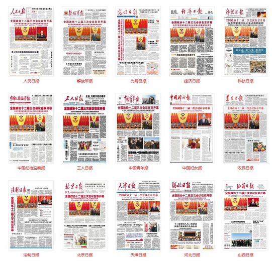 全国党报头版聚焦全国政协十二届三次会议开幕