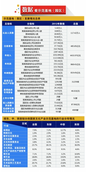 为了解示范基地和园区总的发展情况,摸清家底、对症施策,文化部组织专门人员,经过实地考察、数据统计等,撰写了《国家级文化产业示范(试验)园区、国家文化产业示范基地2013年度总结报告》(以下简称《总结报告》)。从整体上看,国家文化产业示范基地和国家级文化产业示范(试验)园区在2013年取得了又好又快的发展。发展规模方面,基地和园区的企业文化产业从业人数和公司注册资本大幅增加,年收入和利润均呈现出较快增长。