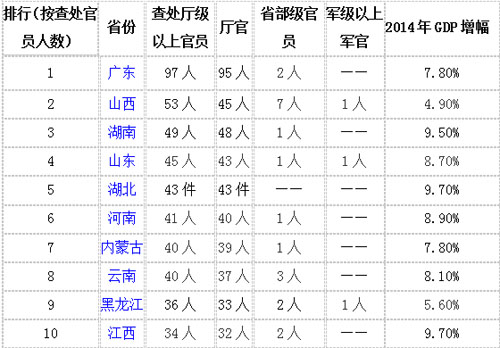 据统计,2014年,各省(自治区、直辖市)通报查处厅级以上官员人(件)数由多到少的排名,前十名依次为:广东、山西、湖南、山东、湖北、河南、内蒙古、云南、黑龙江、江西。