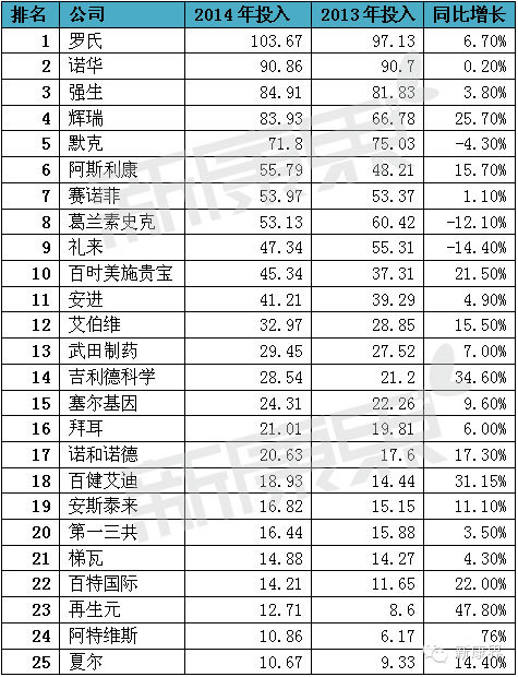 2014年全球生物制药R&D投入前25强的榜单依据2014年各公司年报或新闻中的公认的会计准则的R&D投入进行排名。榜单中公布了公司的名称,2014年R&D投入,2013年R&D投入及变化情况。