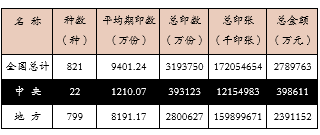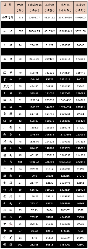 全国性和省级报纸。全国共有全国性和省级报纸1018种,平均期印数17760.95万份,总印数326.13亿份,总印张1378.00亿印张。占报纸总品种53.16%,总印数67.60%,总印张65.69%。与上年相比种数下降0.39%,平均期印数增长5.99%,总印数增长0.21%,总印张下降5.54%。其中:1.全国性报纸219种,平均期印数3331.48万份,总印数80.82亿份,总印张231.03亿印张;占报纸总品种11.44%,总印数16.75%,总印张11.01%。与上年相比种数下降0.45%, 平均期印数增长3.47%,总印数增长5.32%,总印张增长5.62%。 2.省级报纸799种,平均期印数14429.47万份,总印数245.31亿份,总印张1146.97亿印张;占报纸总品种41.72%,总印数50.85%,总印张54.67%。与上年相比种数下降0.37%,平均期印数增长6.58%,总印数下降1.37%,总印张下降7.51%。