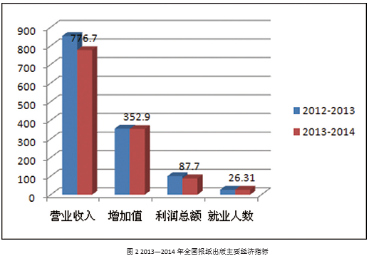 据《2013年新闻出版产业分析报告》,2013—2014年,报纸出版实现营业收入776.7亿元,比上年降低8.9%;增加值352.9亿元,利比上年降低0.6%,润总额87.7亿元,比上年降低11.7%。2013—2014年,报纸出版就业人数26.31万人,比上年减少了0.01(见图2)。