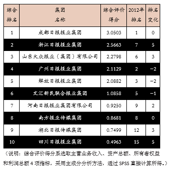 2013—2014年全国报刊出版集团总体经济规模的前10名依次为成都日报报业集团、浙江日报报业集团、山东大众报业(集团)有限公司、广州日报报业集团、解放日报报业集团、文汇新民联合报业集团、河南日报报业集团有限公司、南方报业传媒集团、湖北日报传媒集团和四川日报报业集团(见表4)。