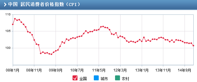 3月10日,统计局发布数据显示,2015年2月份,全国居民消费价格总水平同比上涨1.4%。其中,城市上涨1.5%,农村上涨1.2%;食品价格上涨2.4%,非食品价格上涨0.9%;消费品价格上涨1.1%,服务价格上涨2.2%。1-2月平均,全国居民消费价格总水平比去年同期上涨1.1%。