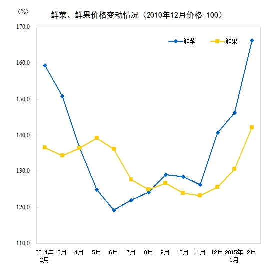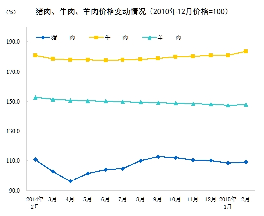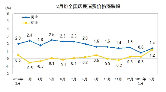 2015年2月份,全国居民消费价格总水平同比上涨1.4%。其中,城市上涨1.5%,农村上涨1.2%;食品价格上涨2.4%,非食品价格上涨0.9%;消费品价格上涨1.1%,服务价格上涨2.2%。1-2月平均,全国居民消费价格总水平比去年同期上涨1.1%。