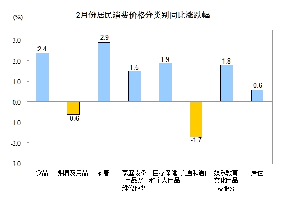 2月份,非食品价格同比上涨0.9%。其中,衣着、医疗保健和个人用品、娱乐教育文化用品及服务、家庭设备用品及维修服务、居住价格分别上涨2.9%、1.9%、1.8%、1.5%和0.6%;交通和通信、烟酒及用品价格分别下降1.7%和0.6%。