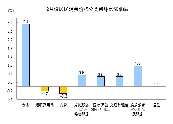 2月份,食品价格环比上涨2.9%。其中,鲜菜价格上涨13.6%,影响居民消费价格总水平上涨约0.46个百分点;鲜果价格上涨8.9%,影响居民消费价格总水平上涨约0.21个百分点;水产品价格上涨6.1%,影响居民消费价格总水平上涨约0.16个百分点;猪肉价格上涨0.8%,影响居民消费价格总水平上涨约0.02个百分点。