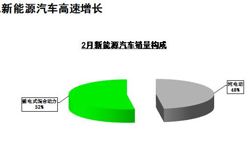 2月新能源汽车生产6190辆,销售6045辆,同比分别增长2.7倍和3倍。其中纯电动汽车产销分别完成3061辆和2890辆,同比分别增长2.8倍和4倍;插电式混合动力汽车产销分别完成3129辆和3155辆,同比分别增长2.7倍和2.4倍。