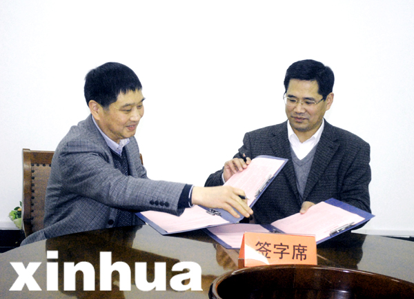 黄石李时珍药业集团有限公司董事长黄中桥(左)与武汉工程大学校长王存文(右)签署校企合作协议。