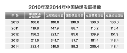 经济日报上海3月26日电 记者王玉玲 徐红报道:在2015中国快递论坛上,国家邮政局首次对外发布了中国快递发展指数。2014年,中国快递发展指数达到282.4,比上年增长70.8,近4年的年均增速达到29.6%。总体来看,我国快递业保持了持续快速发展的良好态势,快递行业服务能力、服务水平稳步提高,普及范围进一步扩展,社会影响力全面提升。