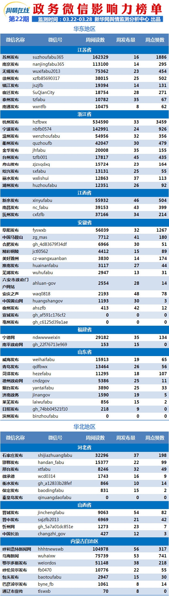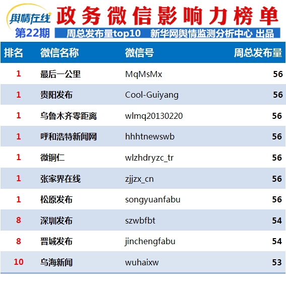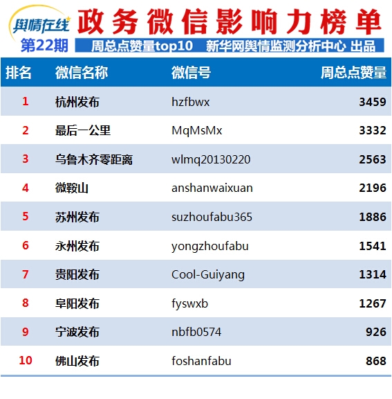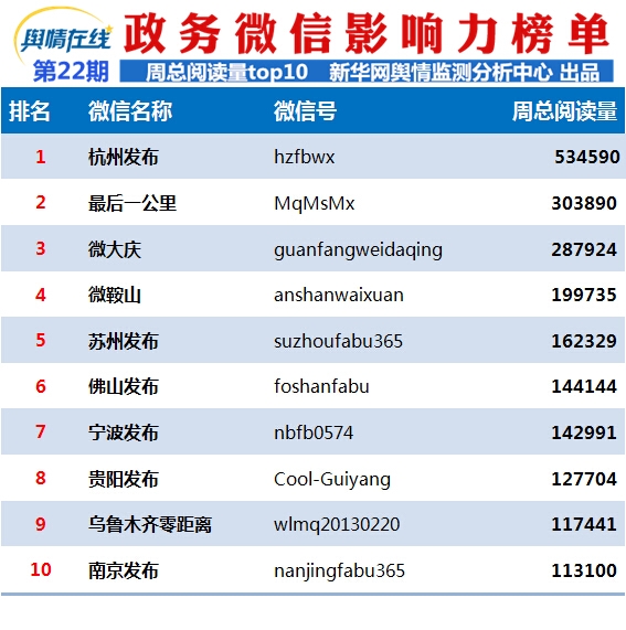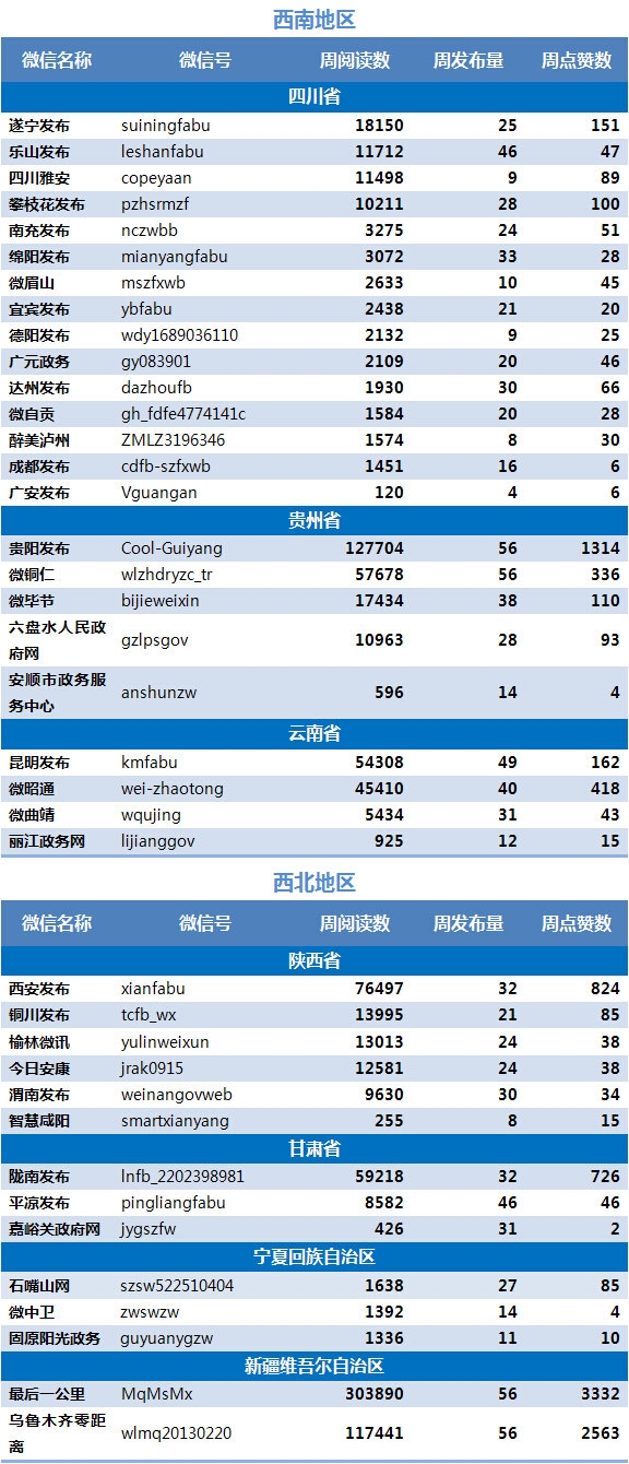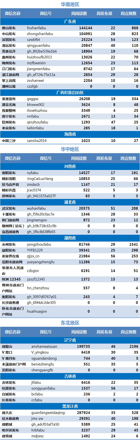 此外,为方便考察较活跃的政务微信公号在全国范围内的影响力,本榜单还对位居周总阅读量、周总发布量、周总点赞量全国前10位的政务微信公号分别进行了排名。