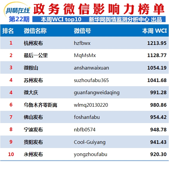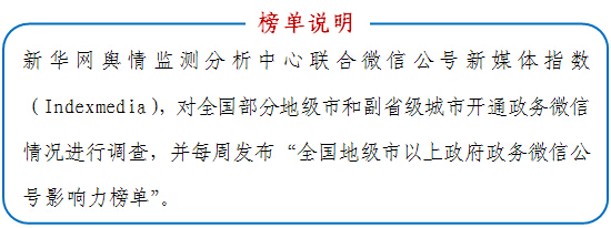 最后,为综合评定各政务微信公号的热度及传播趋势,本榜单提供当周“微信传播指数-WCI”全国前十排名。