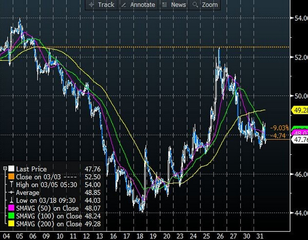 (上图为ICE布伦特5月原油期货价格3月份的30分钟走势图,图片来源:Bloomberg)