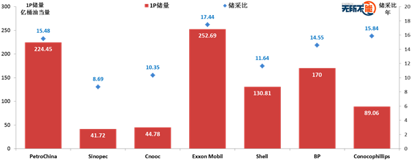 中国石油作为资产规模和产量位居跨国油公司前列的企业,1P储量(证实储量)规模不及埃克森美孚,储采比不及埃克森美孚和康菲;而中国石化和中国海油储采比与国际油公司的差距更大。这均反映出中国三大石油公司未来通过开发建设新建产能的空间和机会不多,产量持续增长的潜力和空间非常有限。