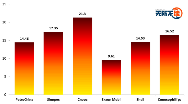与国际石油公司相比,中国三大石油公司的折旧、折耗和摊销明显偏高,尤其是中国海油的单位油气产量折旧、折耗和摊销成本超过20美元/桶油当量,远远高于国内外其他跨国石油公司。单位产量折旧、折耗和摊销反映的是历史成本回收,一旦形成,将很难下调。中国海油的单位油气折旧、折耗和摊销远远高出其他公司可能与该公司2013年收购加拿大上市公司Nexen有关,这应该可以从该公司2011年和2012年的单位产量折旧、折耗和摊销不到15美元/桶油当量得到部分证实。中国石油的单位油气产量折旧、折耗和摊销与国际油公司相当,可能得益于该公司的主要油气资产在中国本土。该项指标偏高,说明中国油公司的资源获取成本偏高,将对公司在低油价时期提升投资能力和保持盈利水平形成较大压力。