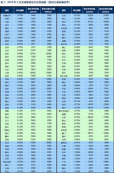 中国指数研究院4月1日发布《2015年3月中国房地产指数系统百城价格指数报告》,中国指数研究院报道:根据中国房地产指数系统百城价格指数对100个城市新建住宅的全样本调查数据,2015年3月,全国100个城市(新建)住宅平均价格为10523元/平方米,环比小幅下跌0.15%。