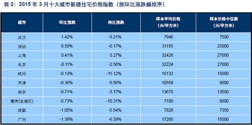 根据百城价格指数对北京、上海等十大城市新建住宅的全样本调查数据显示,2015年3月十大城市住宅均价为18938元/平方米,环比微跌0.1%。具体来看,十大城市中武汉、深圳、上海3个城市环比上涨,上涨城市个数较上月减少1个。其中,武汉上涨1.42%,居首位;深圳、上海涨幅分别为0.59%和0.41%。北京、杭州、天津、南京、重庆(主城区)、成都、广州环比下跌,其中广州、成都跌幅超过1%,分别为1.39%和1.05%,其他城市跌幅均在0.75%以内。