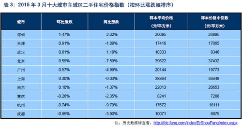 根据对北京等十大城市主城区二手住宅的活跃样本的调查,2015年3月,十大城市主城区二手住宅样本平均价格为26340元/平方米,环比上涨0.48%,同比下跌3.22% .