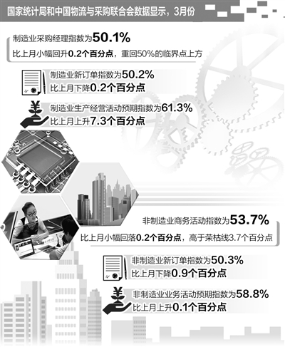 数据显示,3月份,PMI为50.1%,比上月小幅回升0.2个百分点,重回临界点上方;非制造业商务活动指数为53.7%,比上月小幅回落0.2个百分点,高于荣枯线3.7个百分点。