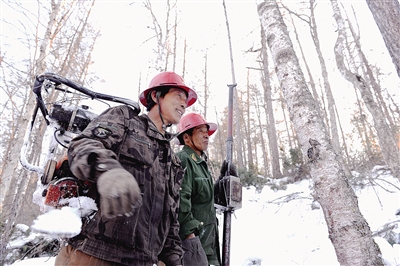 这是内蒙古大兴安岭林管局金河林业局亚金沟林场106工队采伐工张忠义(左)与工友在林中行走(3月13日摄)。连日来,内蒙古大兴安岭林管局下辖19个林业局的最后一批伐木工队在完成预定采伐任务后陆续撤出山林作业一线,放下斧锯的伐木工人们憧憬着停伐转型后的新生活。 新华社记者 张 领摄