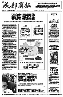 其次,围绕重要议题,拿出重点版面集中火力报道,实现深度开掘与评论支持相结合。单说3月29日见报的情况,国内报媒无一例外地围绕博鳌亚洲论坛正式开幕当天国家主席习近平的主旨演讲《迈向命运共同体 开创亚洲新未来》,在头版和核心内版浓墨重彩地推出主题报道。《南方都市报》《华商报》《北京青年报》等一线都市类平媒紧抓“一带一路的愿景与行动”发布和亚投行发展在博鳌论坛上演“升级版”这两个举世瞩目的重大事件,贡献了《习近平:“一带一路”不是独奏是合唱》《“一带一路”规划出台 圈定18省份》《2020年有望建成东亚经济共同体》等大量的整版报道。同时,绝大多数都市报把当天的社论“交给”了博鳌论坛,《京华时报》《北京青年报》等报纸的社论均很好地呼应了论坛主题,升华了年会的影响力。