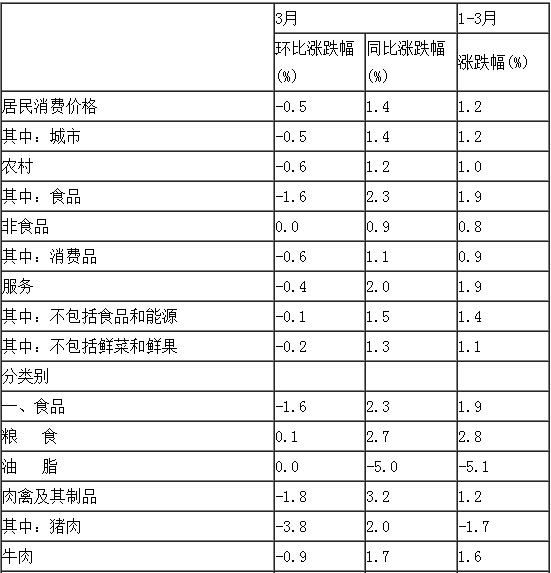 3月份,全国居民消费价格总水平环比下降0.5%。其中,城市下降0.5%,农村下降0.6%;食品价格下降1.6%,非食品价格持平;消费品价格下降0.6%,服务价格下降0.4%。