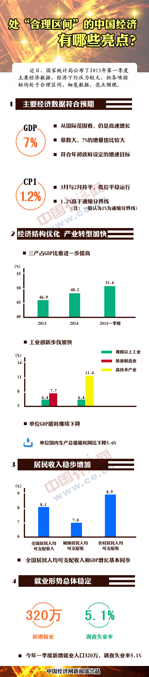 近日,国家统计局公布了2015年第一季度主要经济数据,经济下行压力较大,但各项指标均处于合理区间,细览数据,亮点频现。