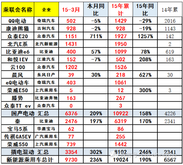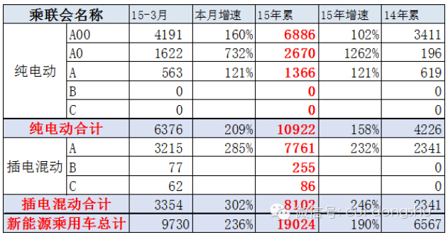 据我们乘联会厂家内部数据,15年1-3月新能源乘用车销售19024台,增速190%,其中的电动车销量10922台,增速158%,而插电式混合动力销售8102台车,增速246%。总体看微型电动车规模最大,A0级纯电动乘用车增速较快,而插电混动的高端也有突破。