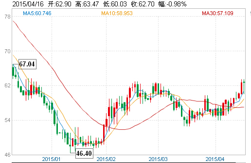 纽约时间4月15日13:30,NYMEX5月原油期货合约收高3.10美元,或5.8%,结算价报每桶56.39美元,为今年最高收位,盘中升至56.69美元的日内高位,为近月原油合约录得的自12月24日来最高水平。