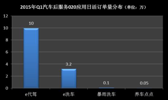 2015年第一季度e代驾日活订单均量达到10万单,名列第一。e洗车单量也较为可观,日活订单达到3.2万单,在汽车洗护市场应用中排名第一,暴雨洗车、养车点点等软件日活订单还较为有限,为1000、500左右。