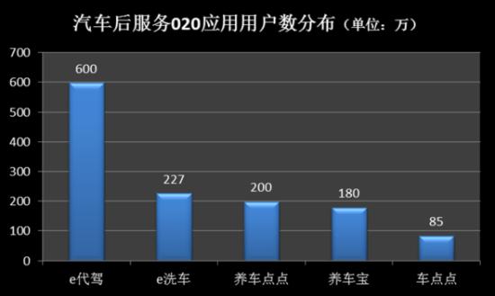 2015年第一季度汽车后服务O2O应用用户分布中,e代驾用户量达到600万左右,排名第一;e洗车通过春节期间的持续服务、持续补贴,5个月时间用户数量达到227万;养车点点经过9个月的努力,在3月底也宣布用户量达到200万;养车宝主要每月给用户提供1次免费洗车机会吸引用户,经过积累达到180万用户规模;车点点用户数量经过9个月积累,用户量达到85万。