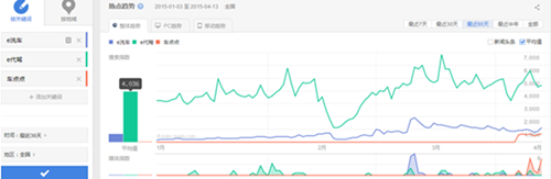 通过百度指数可以看出e代驾经过4年的深度耕耘及递推团队的努力,取得显著的效果。2015年第一季度品牌搜索达到日均4036的成绩,成为汽车后市场O2O应用中的最受关注的企业。