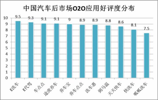 汽车后市场O2O应用整体好评度高于全国应用平均好评。e洗车用户好评度最高,综合评价达到9.5分,排在第一位;e代驾、车点点、途虎养车、养车宝分别以9.3分、9.1分、9.1分、9分的好评成绩,依次排在第二至第五位;养车点点、洗车惠、弼马温、天天快车、快洗车够成的第二梯队,好评分数分别在8分之上,好评分别是8.9分、8.9分、8.8分、8.6分、8.1分;最后由呱呱洗车够成的第三梯队,好评仅为7.5分。