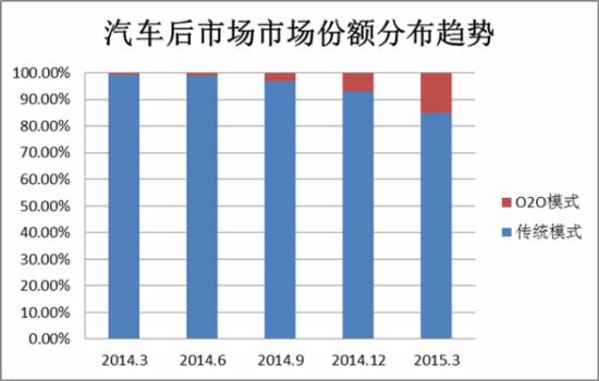 2014年是移动互联网020市场发展元年。2014年第一季度O2O模式企业市场占比不足1%,2015年第一季度这一占比达到14%。互联网属性就是颠覆,打破行业壁垒,颠覆消费模式。汽车后服务市场较为传统保守,行业移动互联网化起步时间晚,致使移动互联网模式、企业进入后,传统市场迅速受到冲击。