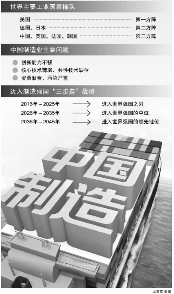 “中国制造2025”总体方案已经国务院常务会议审议通过。根据介绍,“中国制造2025”提出了中国从制造大国转变为制造强国“三步走”的战略:第一个十年进入世界强国之列;第二个十年要进入世界强国的中位;第三个十年即2045年,进入世界强国的领先地位,最终要在建国一百周年成为制造强国。