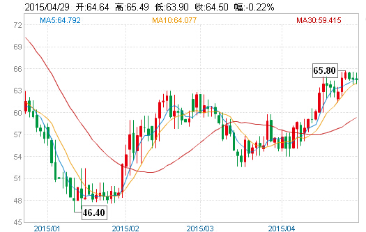 6月布兰特原油期货合约收跌0.19美元或0.3%,报每桶64.64美元,盘中触及65.49美元的高位。