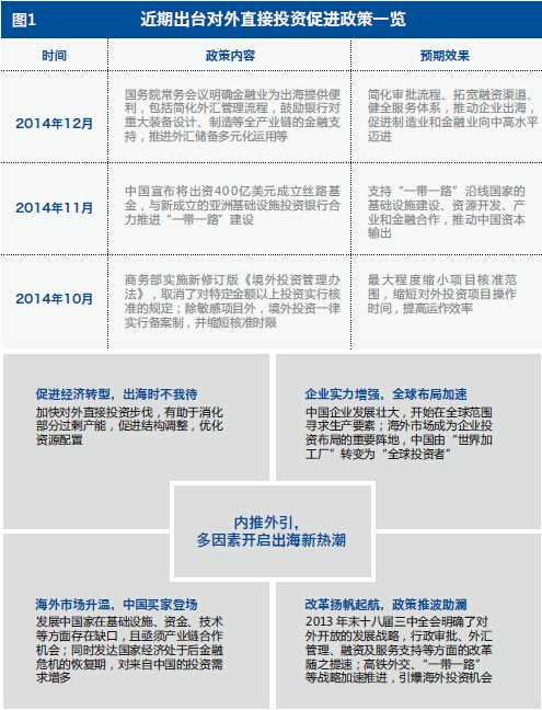 4月22日,全球四大会计所之一安永发布《中国对外直接投资展望2015》报告。分析指出,近期政府出台的系列政策都是以前所未有的力度助推中企出海。其中,新《境外投资管理办法》的实施将对外投资“审批制”改为“备案制”,大大便利企业项目操作;政府加速推进“一带一路”战略,政策红利的不断释放将掀起新一轮对外投资的热潮。